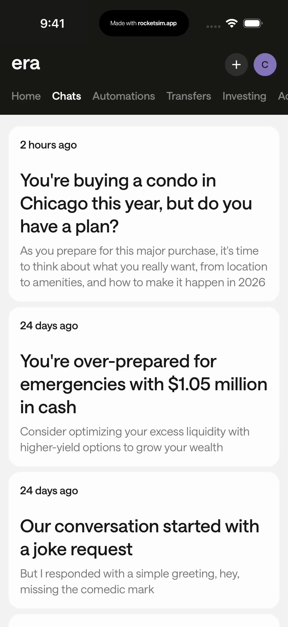 The core of Era is a set of agent-generated tasks, suggestions, and questions for the user to take action on in order to improve their financial health.